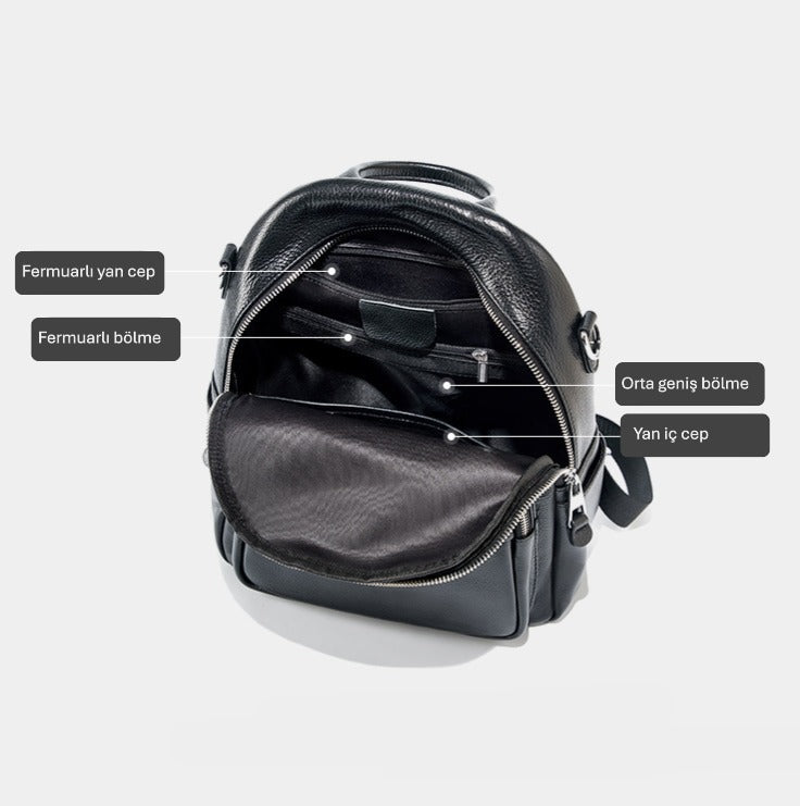 Gerçek deriden üretilmiş kibar ve modern bir kadın sırt çantasıdır.